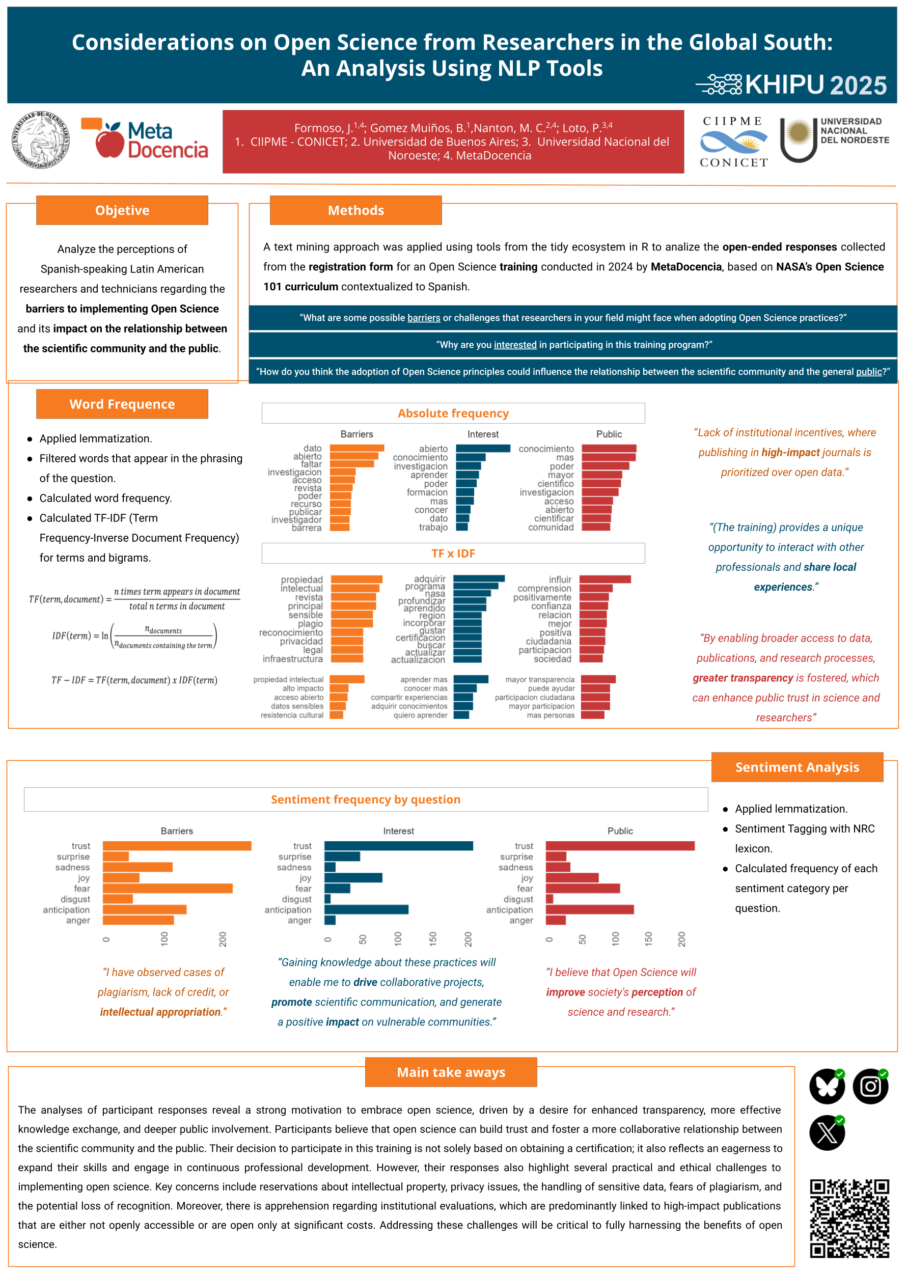 The study analyzed open-ended responses from 285 participants in a 2024 Open Science training conducted by MetaDocencia, based on NASA’s Open Science 101 curriculum. Using text mining tools from the tidy ecosystem in R — word frequency, TF-IDF, sentiment analysis with the NRC lexicon, and topic modeling — we explored three questions: what barriers researchers perceive to adopting Open Science practices, what motivates them to engage with training, and how they expect Open Science to affect the relationship between science and the public.